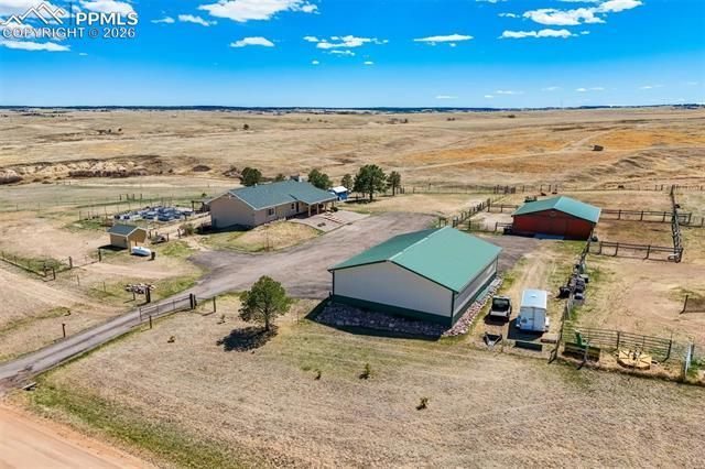Sprawling ranch-style home in desirable Echo Ridge offering true main-level living with an open, airy layout and stunning Front Range views, including Pikes Peak. The great room welcomes you with abundant natural light and a cozy wood-burning stove, flowing seamlessly into the kitchen featuring Corian countertops, oak cabinetry, and newer stainless steel appliances. The main level includes three bedrooms, highlighted by a spacious primary suite with dual closets and a private four-piece bath with double vanities and an updated tiled shower. A remodeled hall bath features newer tile work and a modern vanity, serving the additional bedrooms. The walkout basement is bright and inviting with garden-level windows and tall ceilings, offering an expansive family room. A large laundry area provides ample storage and space for additional appliances. A unique finished flex space—previously used as a market—includes painted concrete floors, finished walls and ceiling, heat, utility sink, and an adjoining full bath. Rustic touches like barn doors add charm, while unfinished space offers additional storage and houses water filtration and softener systems. The exterior is set up for functionality and self-sufficient living. The property features a four-stall barn with barn milk room and with heated tack/feed room and wash sink, fenced and cross-fenced pastures, a chicken coop and broader enclosure in barn, loafing shed, and a fenced garden area with raised beds designed to keep wildlife out. A large Cleary metal shop offers three garage doors, concrete floors, and 220-volt power—ideal for equipment, hobbies, or business use. Additional storage shed included. The land offers beautiful rolling topography with ravines, adding character and usability. This property is a hobby farmer’s dream or perfect for those seeking a more self-sustaining lifestyle with space for animals, gardens, and country living—all while enjoying incredible mountain views.